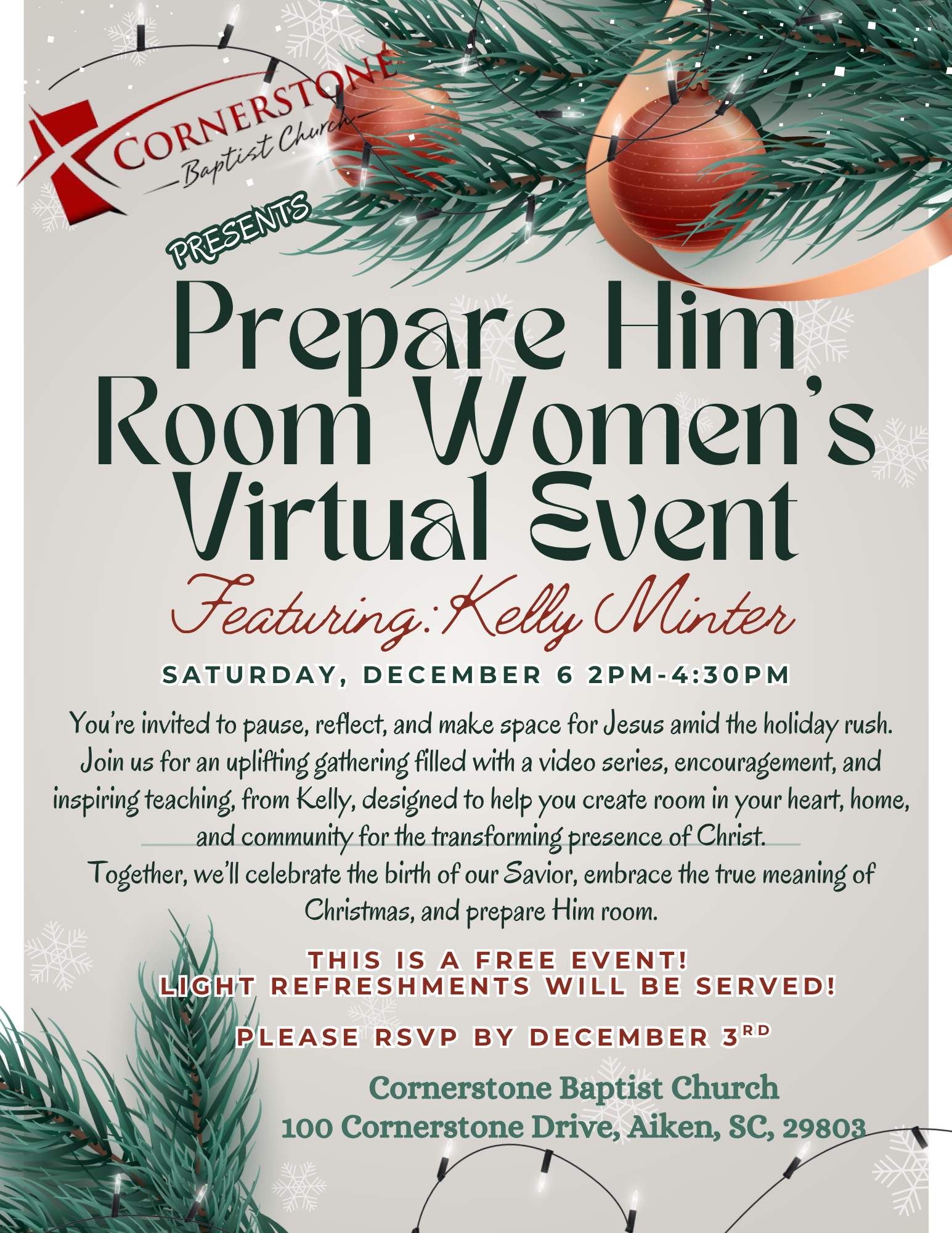 Register here to join us on Saturday, December 6, 2025 for the Prepare Him Room Virtual Event with Kelly Minter to be held at Cornerstone Baptist Church at 100 Cornerstone Drive, Aiken.
